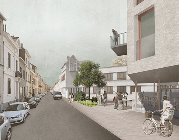 Le projet prend place dans un paysage fortement affecté par la ruralité passée. Cette grande parcelle est habitée par une maison aux détails raffinés et de qualités ainsi qu’un grand platane, témoignant d’un jardin passé. Une extension datant des années 1950 s’accroche à la maison. L’ensemble abrite les services communaux. Le projet s’articule autour du platane en lui offrant une plus grande visibilité de la rue. Les bureaux poursuivent la continuité de l’extension des années 50 en axant la promenade vers l’intérieur d’ilot. On retrouve donc plusieurs strates historiques de la parcelle ; la maison 19ème l’extension 20ème, les logements et bureaux 21ème.
